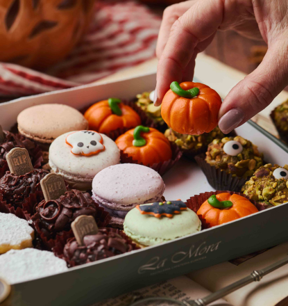 Alfajorcitos, trufas de chocolate, trufas de pistacho, macarrones y maná (4 und c/u) con apliques de Halloween.