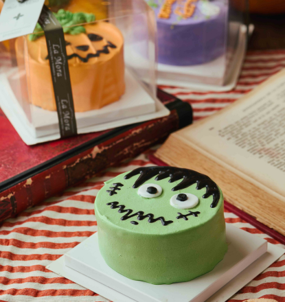 Keke de chocolate relleno de manjar con temática de Frankenstein.