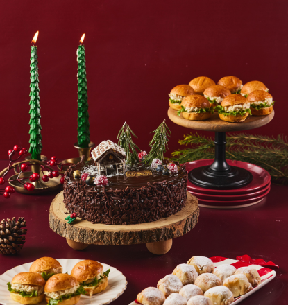 Delicios torta de chocolate rellena de fudge y manjar con casita navideña de Lebkuchen/ Gingerbread. Aprox 10 - 12 porciones + 12 pollo en mini brioche + 12 empanaditas de carne.