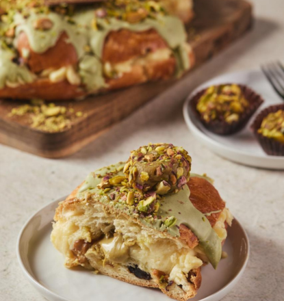 Bizcocho suave relleno de crema de pistacho y crema pastelera, decorado con pistacho y ganache de pistacho.